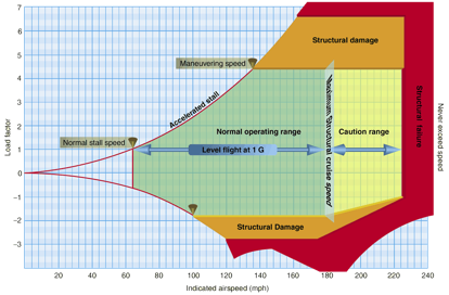 Remember that as load factor increases --- such as in a steep turn or a rapid pull-up --- the stall speed also increases, at the square root of the load factor increase. So, if we were to depict on a graph this relationship between airspeed and load factor (or G-forces), we would have what is known as a V-G diagram: