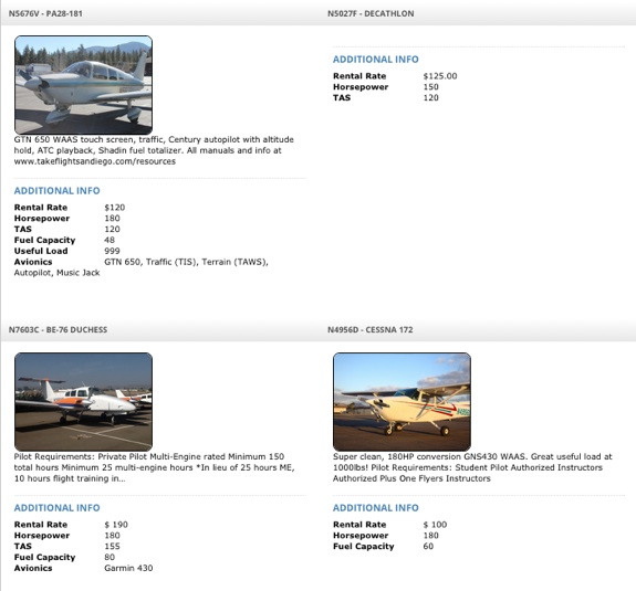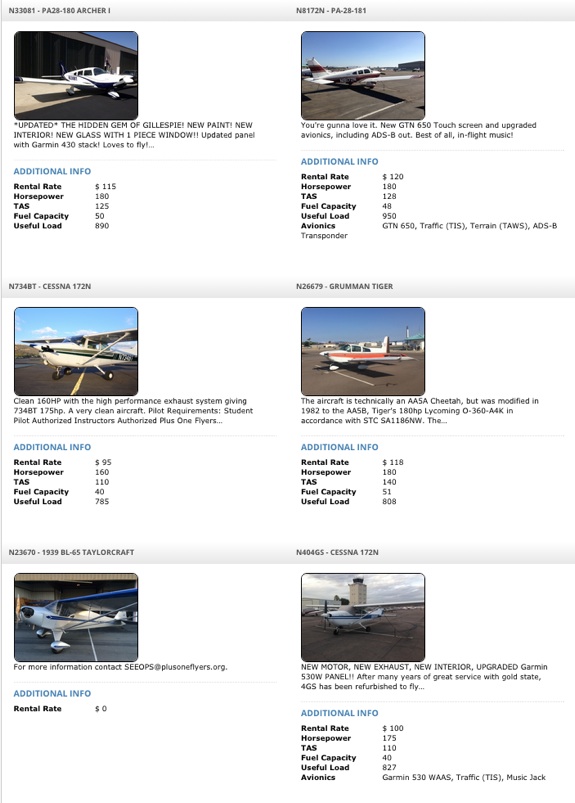 Plus One Flyers gives you access to 80+ airplanes, at rates 20-30% less than FBO’s and Flight Schools. There’s just a 1-hour daily minimum for multi-day rentals, and full-service re-fueling is included (all airplanes rent “wet”, with fuel included). Airplanes are based at Gillespie, Montgomery, Ramona, and Palomar Airports.